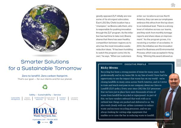 greatly opposed ZLF initially are now some of its strongest advocates . Each LSG Sky Chefs location has a “ champion ,” as Bivens calls them , who is responsible for pushing innovation through the ZLF program . As the initiative has had time to take root , Bivens shares that there has seen healthy competition between regions as to who has the most innovative wastereduction ideas . “ It has been humbling to watch the program come into its own ,” he says . “ When our customers enter our locations across North America , they can see our employees embrace this ethos from the top down to an individual level . There is a strong level of initiative across our teams , and they work from monthly tonnage reports and share ideas on improvement .” As the program grows , it is receiving a number of accolades . In 2014 , the initiative won the innovation award for Business and Environmental Process , which was accepted in Hong Kong . “ Winning this award allowed us Ricky Bivens
