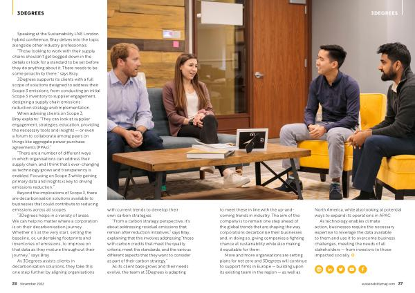 “ 3Degrees helps in a variety of areas . We can help no matter where a corporation is on their decarbonisation journey . Whether it ’ s at the very start , setting the baseline , or , undertaking footprints and inventories of emissions , to improve on that data as they mature throughout their journey ,” says Bray .