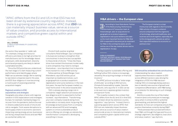 Fellow partner at Roland Berger , Sven Kleindienst , says ESG will be just as important as traditional motives , such as geographical or product expansion , digitalisation and cycle resilience , in the next five years . He says the European market is a clear frontrunner in this drive towards ESG . “ ESG is already playing a large role in companies ' target selection processes and due diligence and it is expected to further increase ,” says Kleindienst . “ Transforming your own company towards being more sustainable is not easily done . Acquiring the knowledge and processes from a company with an advanced ESG and managing system or a more sustainable product service offering can strongly accelerate the transformation compared to developing everything in-house .