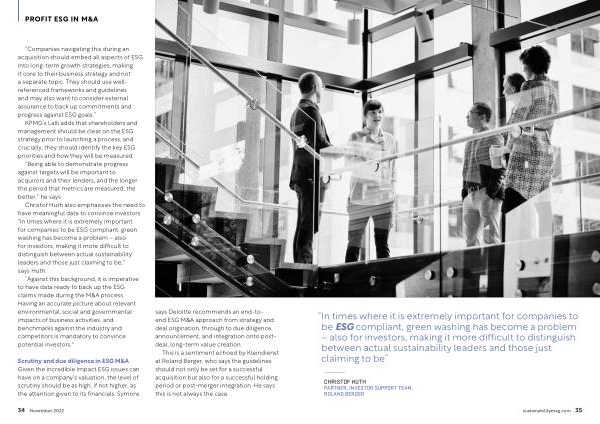 “ Companies navigating this during an acquisition should embed all aspects of ESG into long-term growth strategies , making it core to their business strategy and not a separate topic . They should use wellreferenced frameworks and guidelines and may also want to consider external assurance to back up commitments and progress against ESG goals .”