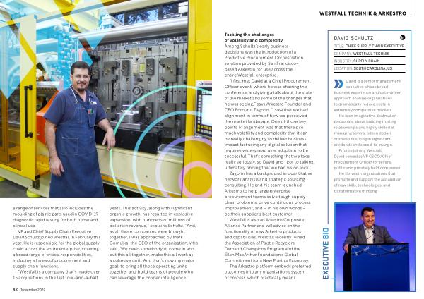 Tackling the challenges of volatility and complexity Among Schultz ’ s early business decisions was the introduction of a Predictive Procurement Orchestration solution provided by San Franciscobased Arkestro for use across the entire Westfall enterprise .