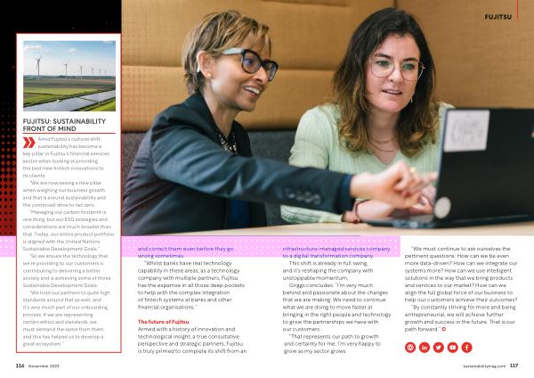 Amid Fujitsu ’ s cultural shift , sustainability has become a key pillar in Fujitsu ’ s financial services sector when looking at providing the best new fintech innovations to its clients .