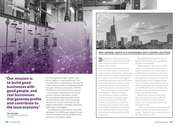 GUY WILLNER CO-FOUNDER & CHAIRMAN , IXAFRICA the first hyperscale data centre in East Africa . IXAfrica , in partnership with Tilisi Developments , is expanding its offering with a new , second campus in the Kenyan capital . Last year , IXAfrica announced a US $ 50m investment into its Nairobi One campus to accelerate its development and help cement IXAfrica ’ s reputation as East Africa ’ s leading hyperscale data centre provider and to cater to the increasing demand for cloud computing services , digital transformation , and edge computing applications in the region .