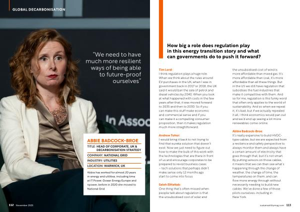 Abbie Badcock-Broe: It’ s really expensive to build HVDCtype cables, but we are expected from a resilience and safety perspective to always monitor them and always have a certain amount of electricity that goes through that, but it’ s not smart. By putting sensors on those cables, it means that we can then see what’ s happening through the change of weather, the change of time, the temperatures on them, and can flow more energy through without necessarily needing to build new cables. We’ ve done a few of those pilots ourselves, including in New York. sustainabilitymag. com 113