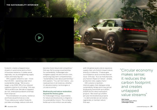 This link between circularity, resilience and financial performance is vital.“ If you reduce your carbon footprint, you take out energy, reduce costs and become more robust and competitive,” Dirk says. By focusing on partnerships for sustainability, Volkswagen also mitigates supply risk and controls costs, enhancing long-term competitiveness.“ Sustainability is also about partnerships,” Dirk explains.“ You can’ t do it alone – you need partners in all instances, whether it’ s decarbonisation, technologies or circular economy.”