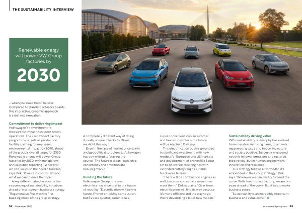 Commitment to delivering impact Volkswagen’ s commitment to measurable impact is evident across operations. The Zero Impact Factory programme targets all production facilities, aiming for near-zero environmental impact by 2040, ahead of the group’ s overall target for 2050. Renewable energy will power Group factories by 2030, with transparent annual public reporting.“ Wherever we can, we push the needle forward,” says Dirk.“ If we’ re in control, let’ s do what we can to drive the topic.”