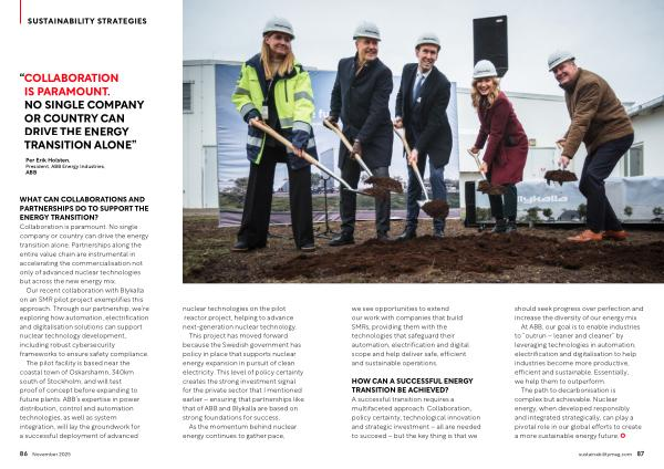 The pilot facility is based near the coastal town of Oskarshamn, 340km south of Stockholm, and will test proof of concept before expanding to future plants. ABB’ s expertise in power distribution, control and automation technologies, as well as system integration, will lay the groundwork for a successful deployment of advanced nuclear technologies on the pilot reactor project, helping to advance next-generation nuclear technology. This project has moved forward because the Swedish government has policy in place that supports nuclear energy expansion in pursuit of clean electricity. This level of policy certainty creates the strong investment signal for the private sector that I mentioned earlier – ensuring that partnerships like that of ABB and Blykalla are based on strong foundations for success.