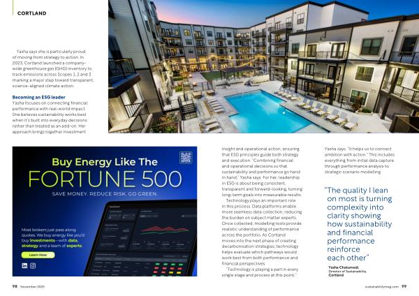 Becoming an ESG leader Yasha focuses on connecting financial performance with real-world impact. She believes sustainability works best when it’ s built into everyday decisions rather than treated as an add-on. Her approach brings together investment 98 November 2025