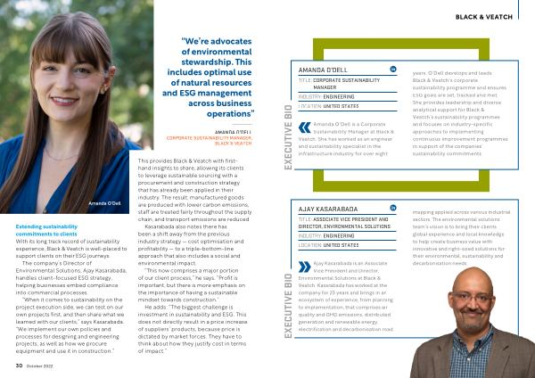 Sustainability Manager at Black & Veatch . She has worked as an engineer and sustainability specialist in the infrastructure industry for over eight years . O ’ Dell develops and leads Black & Veatch ’ s corporate sustainability programme and ensures ESG goals are set , tracked and met . She provides leadership and diverse analytical support for Black & Veatch ’ s sustainability programmes and focuses on industry-specific approaches to implementing continuous improvement programmes in support of the companies ’ sustainability commitments . EXECUTIVE BIO