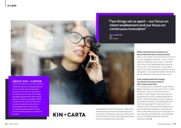 If you could go back and change one decision you have made as CEO , what would it be ? If I could go back , I would be myself sooner . When I became a Group CEO of Kin + Carta Americas , I spent my first few months trying to act and lead in the same way my predecessor would . This generated some friction with employees as they could see my leadership wasn ’ t completely genuine . And they were right ! If I had been more authentic from the start and leaned on my own leadership style faster , it would have been a smoother transition for everyone . In my new role as Global CEO , I have learned to trust myself and lead with my own authentic style . sustainabilitymag . com 53