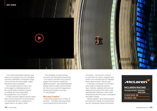 In 2023, McLaren trialled recycled carbon fibre at the US Grand Prix and introduced bio-based flax fibre as a substitute for carbon fibre in car seats in 2020.