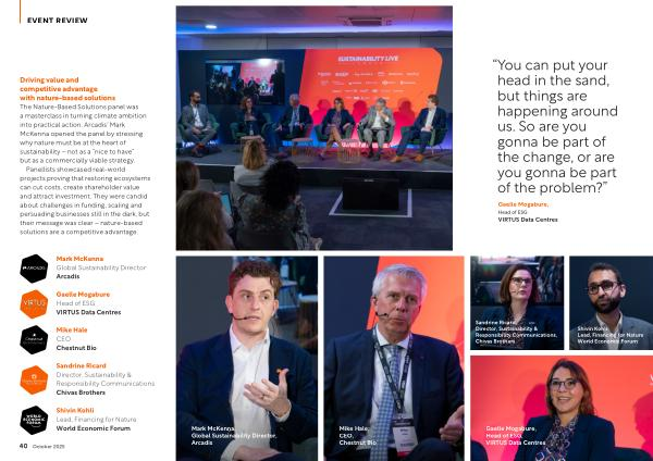 Driving value and competitive advantage with nature-based solutions The Nature-Based Solutions panel was a masterclass in turning climate ambition into practical action. Arcadis’ Mark McKenna opened the panel by stressing why nature must be at the heart of sustainability – not as a“ nice to have” but as a commercially viable strategy.