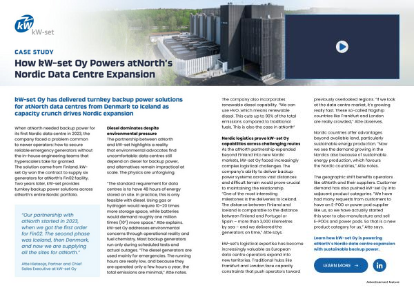 When atNorth needed backup power for its first Nordic data centre in 2023, the company faced a problem common to newer operators: how to secure reliable emergency generators without the in-house engineering teams that hyperscalers take for granted. The solution came from Finland. kWset Oy won the contract to supply six generators for atNorth’ s Fin02 facility. Two years later, kW-set provides turnkey backup power solutions across atNorth’ s entire Nordic portfolio.
