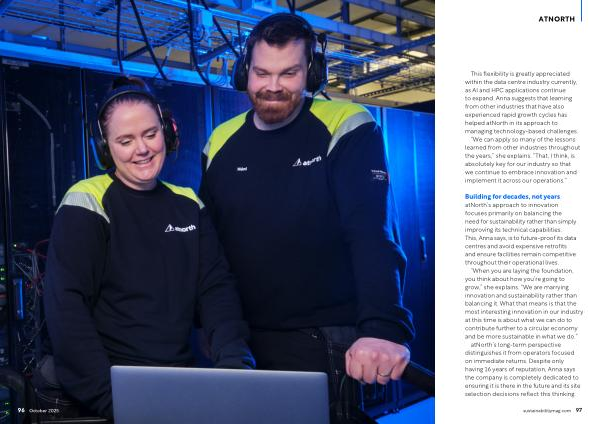 “ When you are laying the foundation, you think about how you’ re going to grow,” she explains.“ We are marrying innovation and sustainability rather than balancing it. What that means is that the most interesting innovation in our industry at this time is about what we can do to contribute further to a circular economy and be more sustainable in what we do.” atNorth’ s long-term perspective distinguishes it from operators focused on immediate returns. Despite only having 16 years of reputation, Anna says the company is completely dedicated to ensuring it is there in the future and its site selection decisions reflect this thinking.