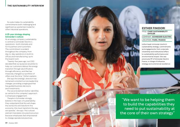 Esther leads Schneider Electric’ s sustainability strategy, commitments and engagements, from corporate citizenship and institutional affairs to sustainability performance and environmental impact. She was previously VP of Schneider Electric France, in charge of influence, strategy and commercial excellence.
