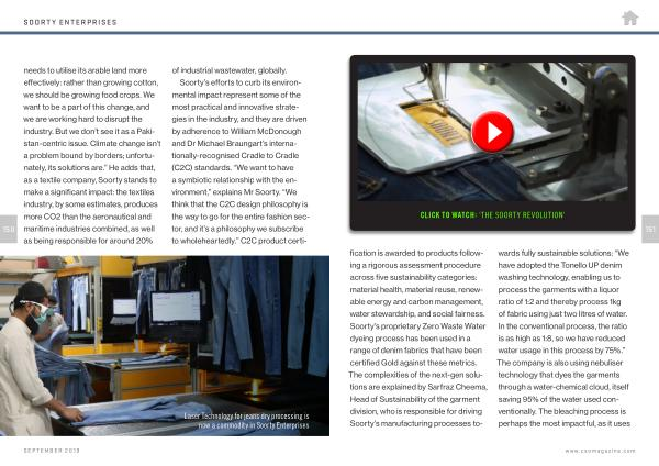 fication is awarded to products following a rigorous assessment procedure across five sustainability categories : material health , material reuse , renewable energy and carbon management , water stewardship , and social fairness . Soorty ’ s proprietary Zero Waste Water dyeing process has been used in a range of denim fabrics that have been certified Gold against these metrics . The complexities of the next-gen solutions are explained by Sarfraz Cheema , Head of Sustainability of the garment division , who is responsible for driving Soorty ’ s manufacturing processes towards fully sustainable solutions : “ We have adopted the Tonello UP denim washing technology , enabling us to process the garments with a liquor ratio of 1:2 and thereby process 1kg of fabric using just two litres of water . In the conventional process , the ratio is as high as 1:8 , so we have reduced water usage in this process by 75 %.” The company is also using nebuliser technology that dyes the garments through a water-chemical cloud , itself saving 95 % of the water used conventionally . The bleaching process is perhaps the most impactful , as it uses
