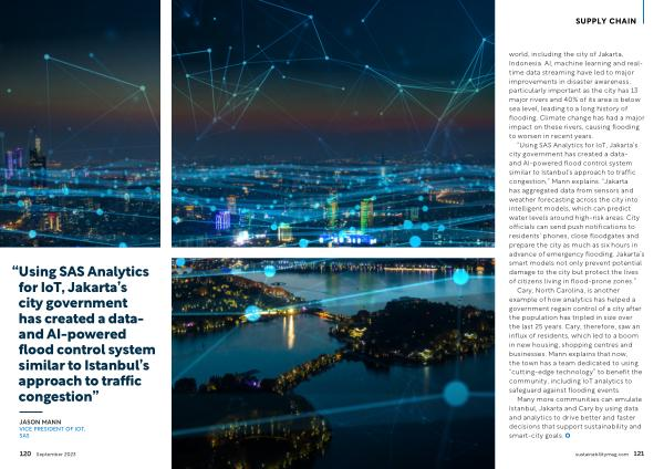 “ Using SAS Analytics for IoT , Jakarta ’ s city government has created a dataand AI-powered flood control system similar to Istanbul ’ s approach to traffic congestion ,” Mann explains . “ Jakarta has aggregated data from sensors and weather forecasting across the city into intelligent models , which can predict water levels around high-risk areas . City officials can send push notifications to residents ’ phones , close floodgates and prepare the city as much as six hours in advance of emergency flooding . Jakarta ’ s smart models not only prevent potential damage to the city but protect the lives of citizens living in flood-prone zones .”