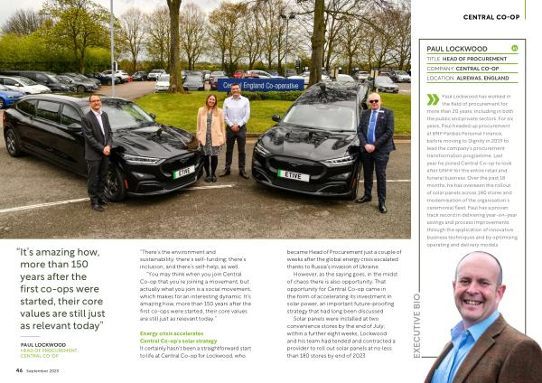 Paul Lockwood has worked in the field of procurement for more than 20 years , including in both the public and private sectors . For six years , Paul headed up procurement at BNP Paribas Personal Finance , before moving to Dignity in 2019 to lead the company ’ s procurement transformation programme . Last year he joined Central Co-op to look after GNFR for the entire retail and funeral business . Over the past 18 months , he has overseen the rollout of solar panels across 180 stores and modernisation of the organisation ’ s ceremonial fleet . Paul has a proven track record in delivering year-on-year savings and process improvements through the application of innovative business techniques and by optimising operating and delivery models .