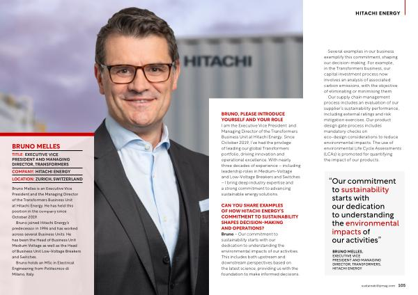 BRUNO, PLEASE INTRODUCE YOURSELF AND YOUR ROLE I am the Executive Vice President and Managing Director of the Transformers Business Unit at Hitachi Energy. Since October 2019, I’ ve had the privilege of leading our global Transformers portfolio, driving innovation and operational excellence. With nearly three decades of experience – including leadership roles in Medium-Voltage and Low-Voltage Breakers and Switches – I bring deep industry expertise and a strong commitment to advancing sustainable energy solutions.