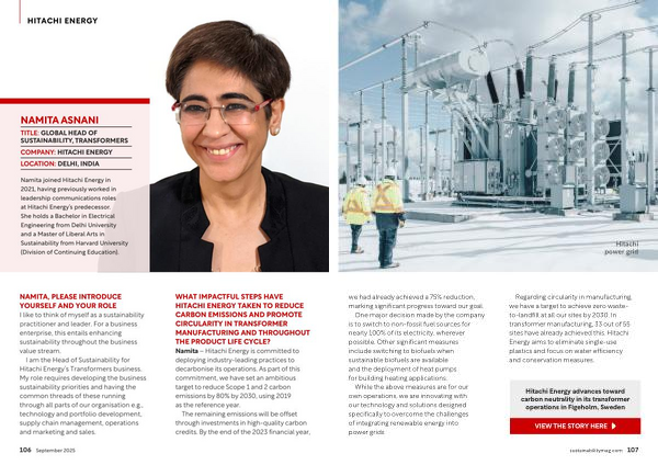 WHAT IMPACTFUL STEPS HAVE HITACHI ENERGY TAKEN TO REDUCE CARBON EMISSIONS AND PROMOTE CIRCULARITY IN TRANSFORMER MANUFACTURING AND THROUGHOUT THE PRODUCT LIFE CYCLE? Namita – Hitachi Energy is committed to deploying industry-leading practices to decarbonise its operations. As part of this commitment, we have set an ambitious target to reduce Scope 1 and 2 carbon emissions by 80 % by 2030, using 2019 as the reference year.