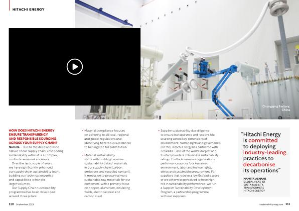• Supplier sustainability due diligence to ensure transparency and responsible sourcing across key dimensions of environment, human rights and governance. For this, Hitachi Energy has partnered with EcoVadis – one of the world’ s largest and trusted providers of business sustainability ratings. EcoVadis assesses organisations’ performance across four key areas: environment, labor and human rights, ethics and sustainable procurement. For suppliers that receive a low EcoVadis score or are otherwise perceived to have high risk in sustainability performance, we run a Supplier Sustainability Development Program, a partnership programme with our suppliers.