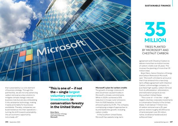 “ This is one of – if not the – single largest voluntary corporate investments in conservation forestry in the United States. It will deliver 7 million tons of carbon removal over a 25-year period, restore roughly 60,000 acres of land and plant over 35 million native, biodiverse hardwood and softwood trees.” sustainabilitymag. com 187