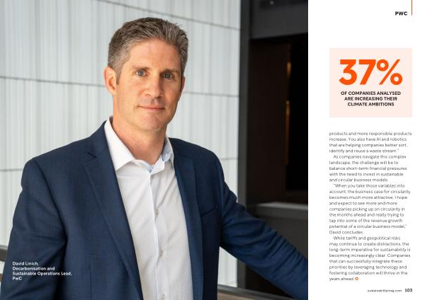 While tariffs and geopolitical risks may continue to create distractions, the long-term imperative for sustainability is becoming increasingly clear. Companies that can successfully integrate these priorities by leveraging technology and fostering collaboration will thrive in the years ahead. sustainabilitymag. com 103