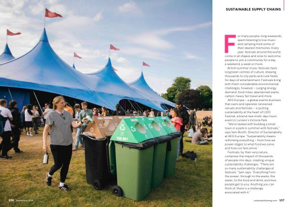 Festivals, by their very nature, compress the impact of thousands of people into days, creating unique sustainability challenges.“ There are so many sustainability challenges at festivals,” Sam says.“ Everything from the power, through to the waste, the water, to the food and drink, and how people get to you. Anything you can think of, there is a challenge associated with it.” sustainabilitymag. com 107