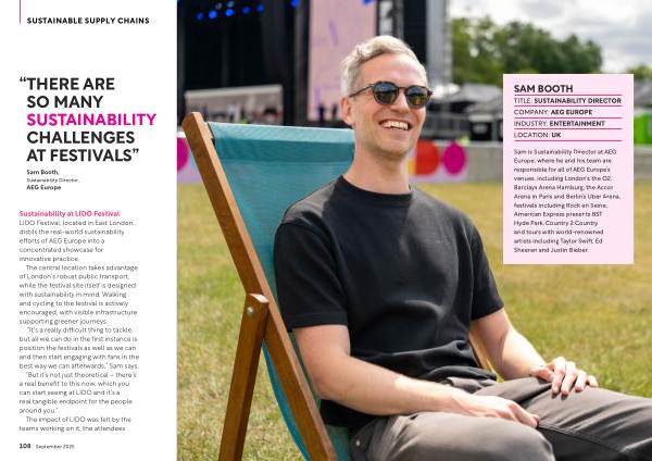Sam is Sustainability Director at AEG Europe, where he and his team are responsible for all of AEG Europe’ s venues, including London’ s the O2, Barclays Arena Hamburg, the Accor Arena in Paris and Berlin’ s Uber Arena, festivals including Rock en Seine, American Express presents BST Hyde Park, Country 2 Country and tours with world-renowned artists including Taylor Swift, Ed Sheeran and Justin Bieber.