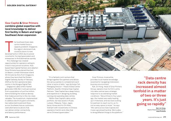 This challenge has created opportunities for operators willing to invest in less proven locations. Asiabased Gaw Capital Partners and Jakarta’ s Sinar Primera have placed their bet on Batam, a small Indonesian island 30 minutes by ferry from Singapore, where they launched the Golden Digital Gateway facility in February 2025 as the first operational data centre in the Nongsa Digital Park.