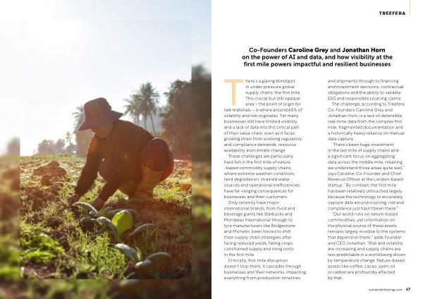 “ Our world runs on nature-based commodities, yet information on the physical source of these assets remains largely invisible to the systems that depend on them,” adds Founder and CEO Jonathan.“ Risk and volatility are increasing and supply chains are less predictable in a world being driven by temperature change. Nature-based assets like coffee, cacao, palm oil or rubber are profoundly affected by that. sustainabilitymag. com 67