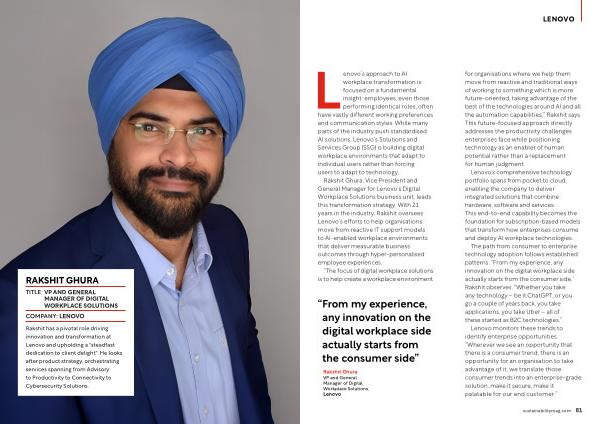 Rakshit has a pivotal role driving innovation and transformation at Lenovo and upholding a " steadfast dedication to client delight ". He looks after product strategy, orchestrating services spanning from Advisory to Productivity to Connectivity to Cybersecurity Solutions.