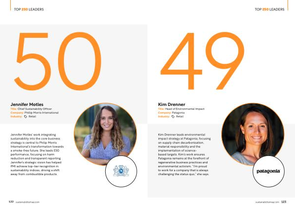Kim Drenner leads environmental impact strategy at Patagonia, focusing on supply chain decarbonisation, material responsibility and the implementation of sciencebased targets. Kim’ s work ensures Patagonia remains at the forefront of regenerative business practices and environmental activism.“ I’ m proud to work for a company that is always challenging the status quo,” she says. sustainabilitymag. com 123