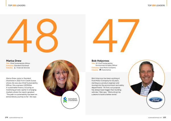 Bob Holycross has been working at Ford Motor Company for 32 years, starting as a product engineer and moving into the environment and safety departments.“ At Ford, our purpose has always been bigger than building vehicles,” Bob says.“ We’ re driven by a desire to build a better world.” sustainabilitymag. com 125