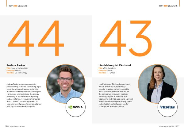 Lisa Malmquist Ekstrand spearheads Vestas’ ambitious sustainability agenda, targeting carbon neutrality by 2030 without offsets. She drives the company’ s circularity strategy, including its goal to produce zerowaste wind turbines. Lisa plays a pivotal role in decarbonising the supply chain and establishing Vestas as a leader in the global energy transition. sustainabilitymag. com 129