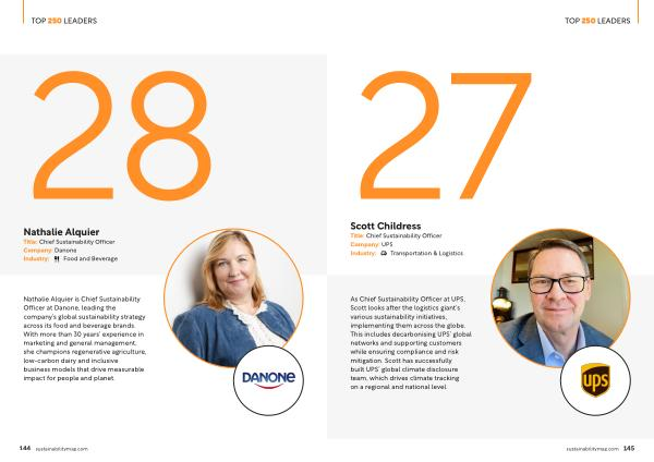 As Chief Sustainability Officer at UPS, Scott looks after the logistics giant’ s various sustainability initiatives, implementing them across the globe. This includes decarbonising UPS’ global networks and supporting customers while ensuring compliance and risk mitigation. Scott has successfully built UPS’ global climate disclosure team, which drives climate tracking on a regional and national level. sustainabilitymag. com 145