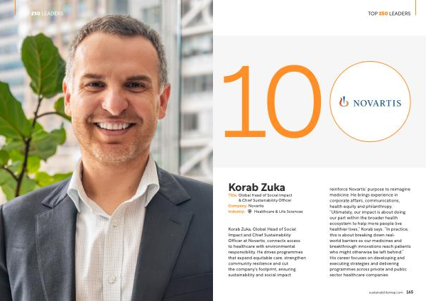 Korab Zuka, Global Head of Social Impact and Chief Sustainability Officer at Novartis, connects access to healthcare with environmental responsibility. He drives programmes that expand equitable care, strengthen community resilience and cut the company’ s footprint, ensuring sustainability and social impact reinforce Novartis’ purpose to reimagine medicine. He brings experience in corporate affairs, communications, health equity and philanthropy.“ Ultimately, our impact is about doing our part within the broader health ecosystem to help more people live healthier lives,” Korab says.“ In practice, this is about breaking down realworld barriers so our medicines and breakthrough innovations reach patients who might otherwise be left behind.” His career focuses on developing and executing strategies and delivering programmes across private and public sector healthcare companies.