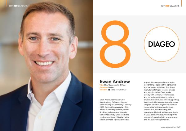 Ewan Andrew serves as Chief Sustainability Officer at Diageo, championing the company’ s Society 2030: Spirit of Progress plan. This initiative aims to promote positive drinking, inclusion and diversity and sustainability. Ewan leads the implementation of this plan, with an aim to make a positive societal impact. He oversees climate, water stewardship, regenerative agriculture and packaging initiatives that shape the future of Diageo’ s iconic brands and supply chains. Ewan works closely with farmers, communities and manufacturing sites to reduce environmental impact while supporting livelihoods. His leadership underscores Diageo’ s ambition to grow its business responsibly, with sustainability at the heart of brand building and operations. He took up his current role in 2019, after previously working in the company’ s supply chain, procurement and manufacturing divisions.