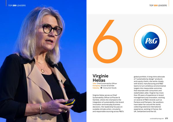 Virginie Helias serves as Chief Sustainability Officer at Procter & Gamble, where she champions the integration of sustainability into brand innovation and everyday business decisions. Her leadership focuses on scalable climate action, circularity and responsible sourcing across P & G’ s global portfolio. A long-time advocate of“ sustainable by design” products and supply chains, she works closely with brand, manufacturing and R & D teams to turn ambitious environmental targets into measurable outcomes that resonate with consumers and stakeholders alike. Virginie has more than 30 years of experience in brand management and innovation, working on several of P & G’ s brands such as Pantene and Pampers. Her positions have taken her around the world, collecting extensive international experience, working in France, the UK, Switzerland and the US.