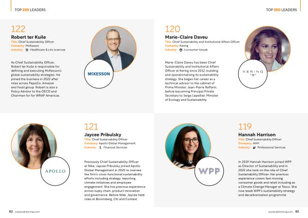 Previously Chief Sustainability Officer at Nike, Jaycee Pribulsky joined Apollo Global Management in 2025 to oversee the firm’ s cross-functional sustainability efforts including strategy, reporting, climate initiatives and employee engagement. She has previous experience across suply chain, product innovation and governance. Before Nike, Jaycee held roles at Bloomberg, Citi and Context.
