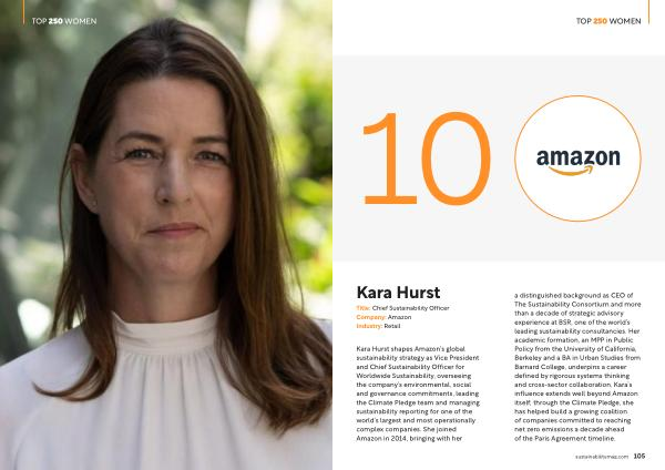 Kara Hurst shapes Amazon’ s global sustainability strategy as Vice President and Chief Sustainability Officer for Worldwide Sustainability, overseeing the company’ s environmental, social and governance commitments, leading the Climate Pledge team and managing sustainability reporting for one of the world’ s largest and most operationally complex companies. She joined Amazon in 2014, bringing with her a distinguished background as CEO of The Sustainability Consortium and more than a decade of strategic advisory experience at BSR, one of the world’ s leading sustainability consultancies. Her academic formation, an MPP in Public Policy from the University of California, Berkeley and a BA in Urban Studies from Barnard College, underpins a career defined by rigorous systems thinking and cross-sector collaboration. Kara’ s influence extends well beyond Amazon itself; through the Climate Pledge, she has helped build a growing coalition of companies committed to reaching net zero emissions a decade ahead of the Paris Agreement timeline.