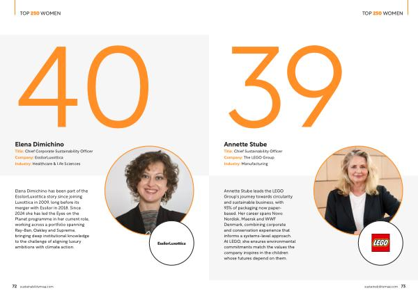 Annette Stube leads the LEGO Group’ s journey towards circularity and sustainable business, with 93 % of packaging now paperbased. Her career spans Novo Nordisk, Maersk and WWF Denmark, combining corporate and conservation experience that informs a systems-level approach. At LEGO, she ensures environmental commitments match the values the company inspires in the children whose futures depend on them. sustainabilitymag. com 73