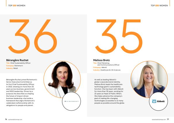 As well as leading Abbott’ s global corporate brand identity, Melissa Brotz leads the healthcare technology giant’ s sustainability function. She has been with Abbott for more than 30 years, working for 22 years as Head of Public Affairs. She helps advance the company’ s goal of making life-changing technologies accessible to as many people as possible around the globe. sustainabilitymag. com 77