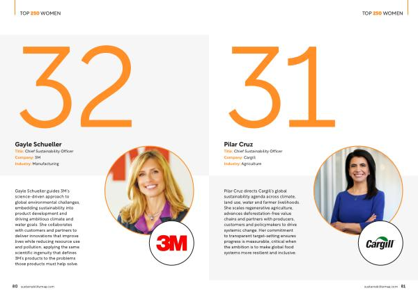 Pilar Cruz directs Cargill’ s global sustainability agenda across climate, land use, water and farmer livelihoods. She scales regenerative agriculture, advances deforestation-free value chains and partners with producers, customers and policymakers to drive systemic change. Her commitment to transparent target-setting ensures progress is measurable, critical when the ambition is to make global food systems more resilient and inclusive. sustainabilitymag. com 81